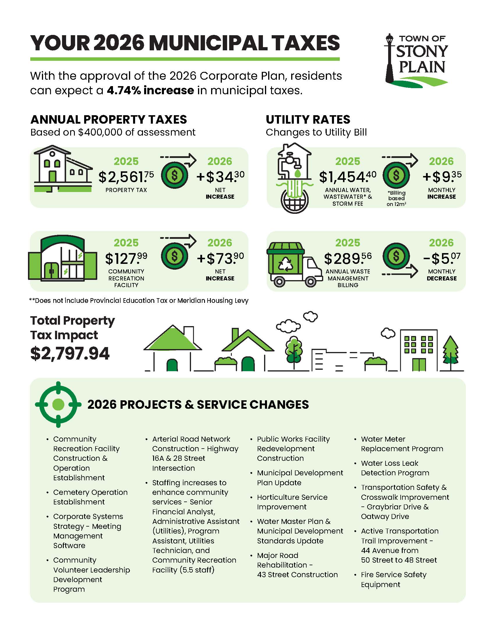 On December 8. 2025 Council approved the 2026 Corporate Plan, and accepted in principle 2027 and 2028. The approved municipal tax increase of 4.74% for 2026 is comprised of 1.72% plus 3.02% for the new Community Recreation Facility. The impact of the 2026 municipal tax and utility increases to a sample residential property assessed at $400,000 is $159.56/year or $13.30/month. The portion of this allocated to the new Community Recreation Facility is $73.90/year or $6.16/month.